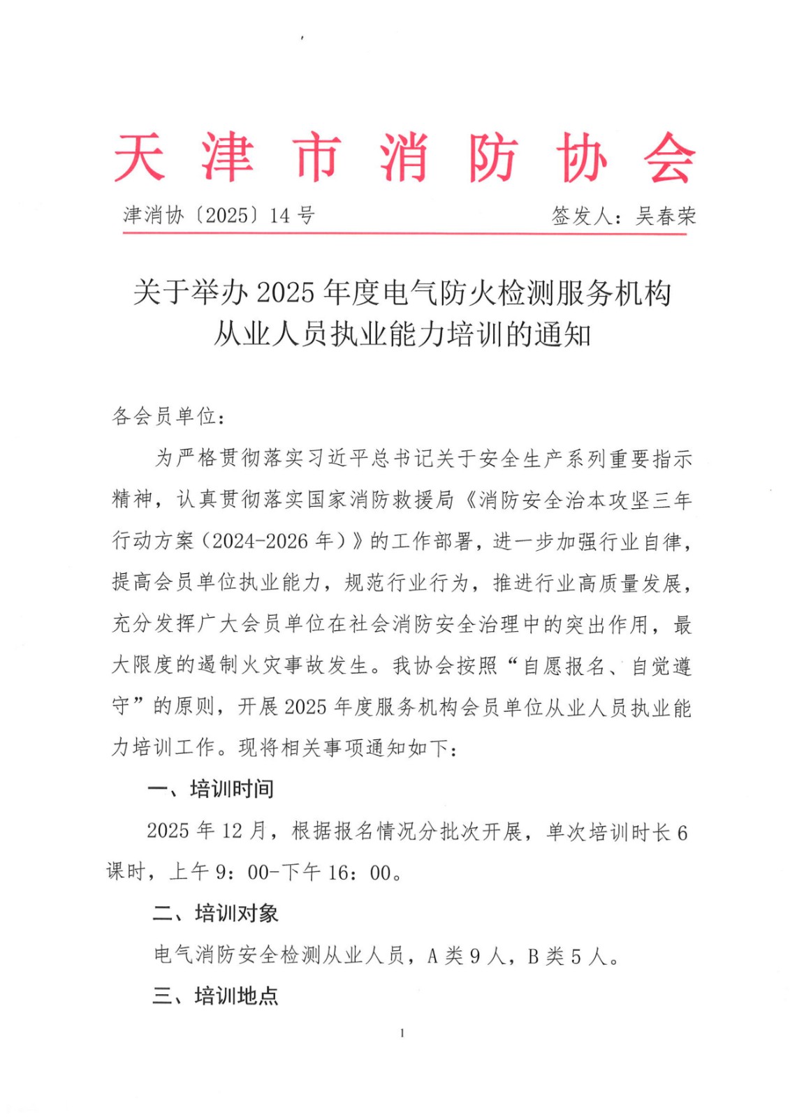 关于举办2025年度电气防火检测服务机构从业人员执业能力培训的通知