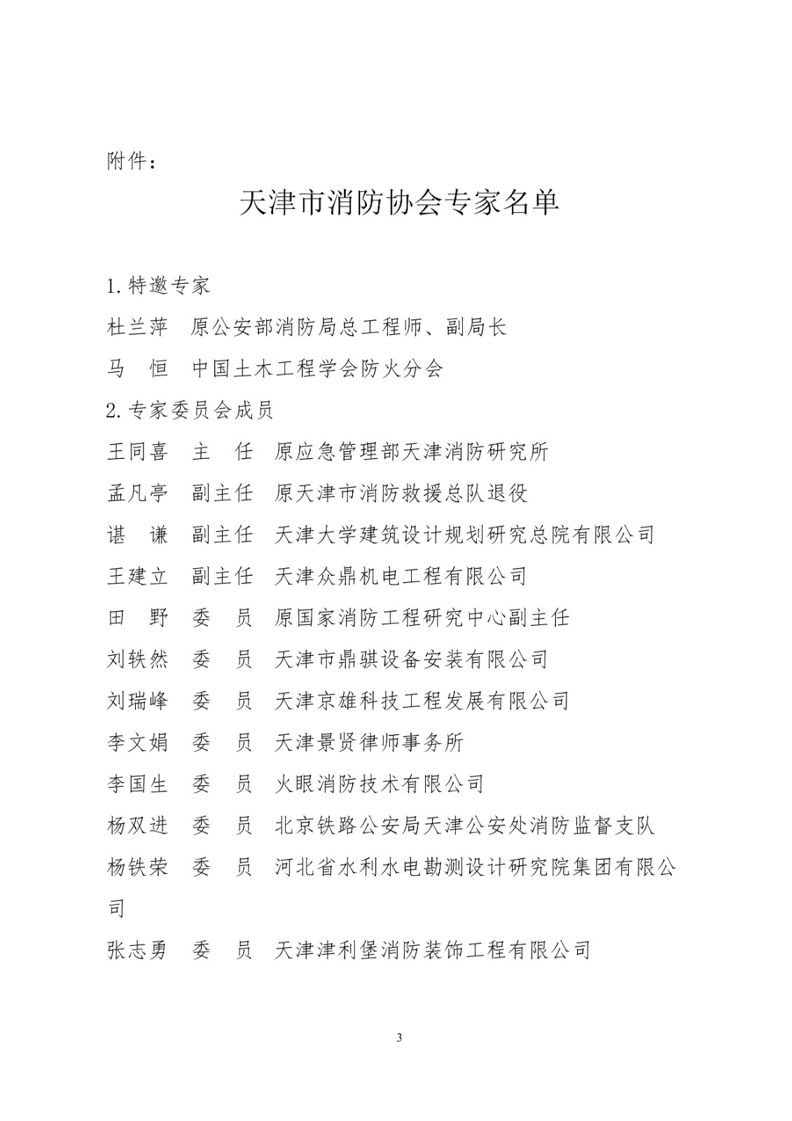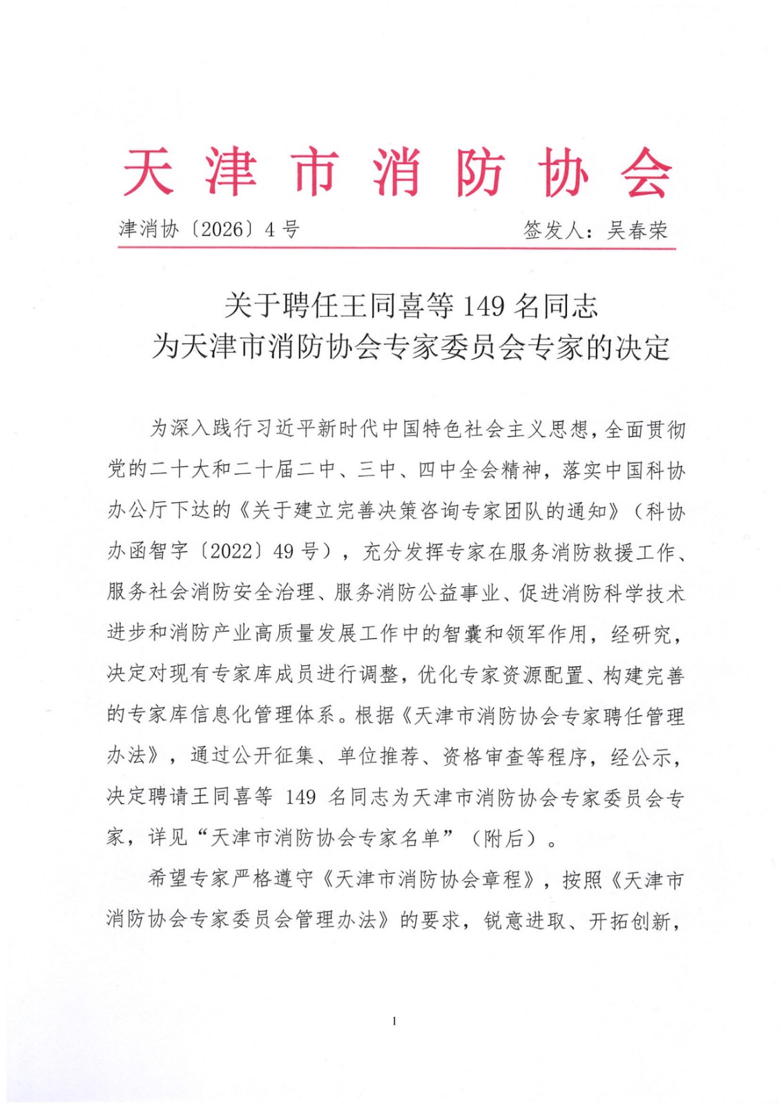 关于聘任王同喜等149名同志为天津市消防协会专家委员会专家的决定