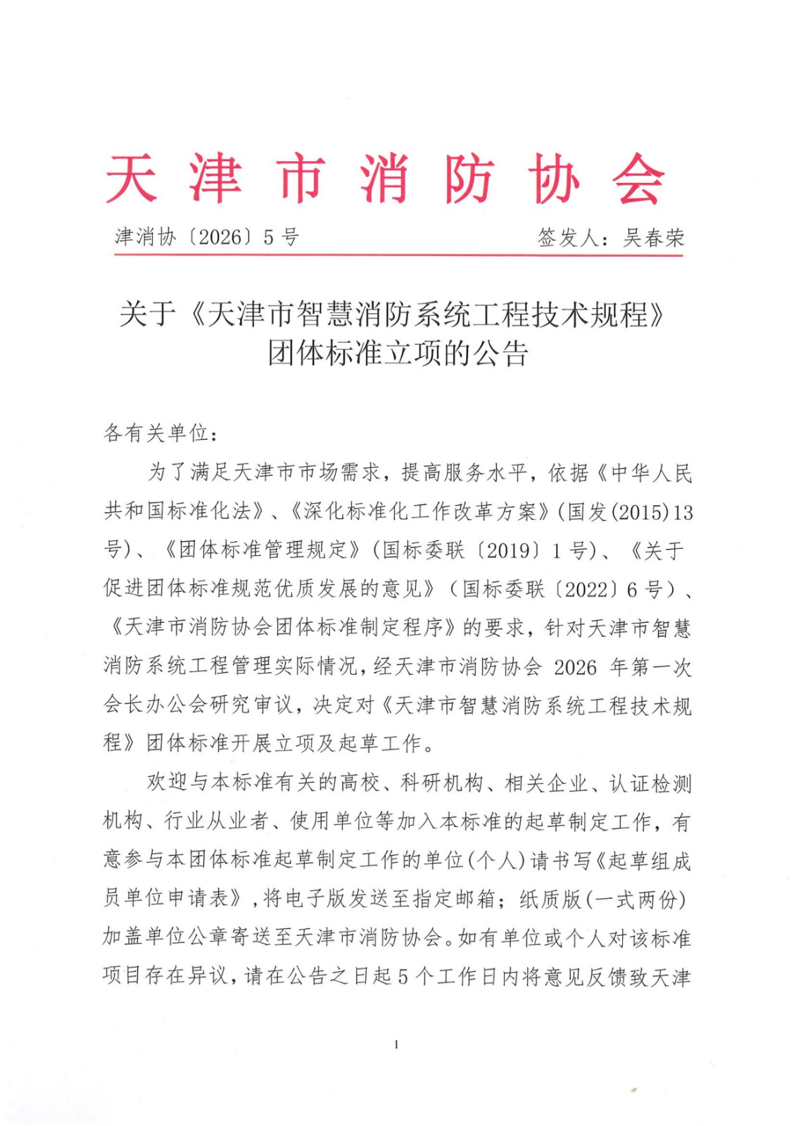 关于《天津市智慧消防系统工程技术规程》团体标准立项的公告